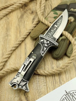 Мощный и очень красивый складной нож. Клинок и рукоять украшены сценами из охоты. Прекрасный подарок любому мужчине. Совершенно новый, в родной упаковке. Сталь клинка нержавеющая 65х13, рукоять - паккавуд. Длина клинка 10 см. Имеется заключение экспертизы о том, что нож является холодным оружием. Общая длина 22,9 см. Нож Витязь Барин имеет широкий клинок, имеет надежный замок Back-Lock, классика складных ножей. Пока объявление висит нож не продан. What’s App 8-928-793-41-77.